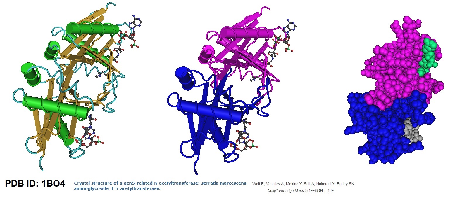 Eva Wolf, Alex Vassilev, Yasutaka Makino, Andrej Sali, Yoshihiro Nakatani, Stephen K. Burley; Crystal Structure of a GCN5-Related N-acetyltransferase. Serratia marcescens Aminoglycoside 3-N-acetyltransferase. Volume 94, Issue 4, p439–449, 21 August 1998. DOI: http://dx.doi.org/10.1016/S0092-8674(00)81585-8.