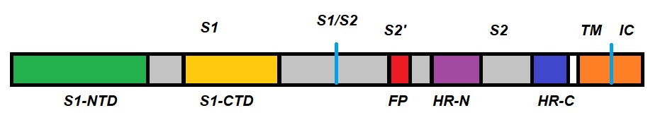 The location of receptor-binding subunit S1, the membrane-fusion subunit S2, the transmembrane anchor (TM), the intercellular tail (IC) are indicated. The location of the S1 N-terminal domain (S1-NTD), the S1 C-terminal domain (S1-CTD), the fusion peptide (FP), and the heptade repeat regions N and C (HR-N and HR-C) are indicated as well.