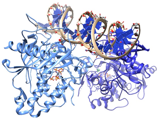 Dimer of Human Adenosine Deaminase Acting on dsRNA mutant E488Q in complex with a dsRNA human GLI1 Gene sequence [PDB ID 6VFF]. | Reaction mechanism of ADAR2 including showing the intermediate. |