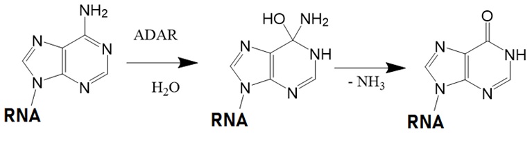 Adenosine deaminases acting on RNA (ADARs) enzymes convert adenosine to inosine in duplex RNA via a deamination reaction of adenosine. Inosine functions similarly to guanosine in many cellular processes including during splicing, translation, and reverse transcription by base pairing with cytidine.