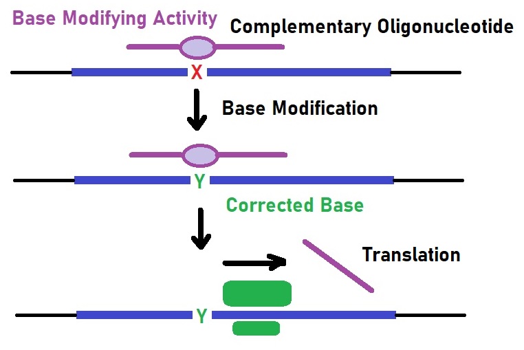 In 1995, Woolf et al. pointed out that treating genetic diseases caused by specific base substitutions is possible by rationally designed RNA editing of mutated RNA sequences. To demonstrate that therapeutic RNA editing is possible, the research group used a synthetic complementary RNA oligonucleotide to direct the correction of a premature stop codon mutation in dystrophin RNA.
